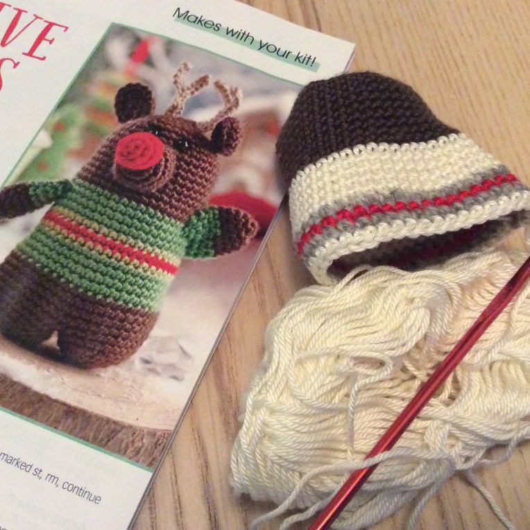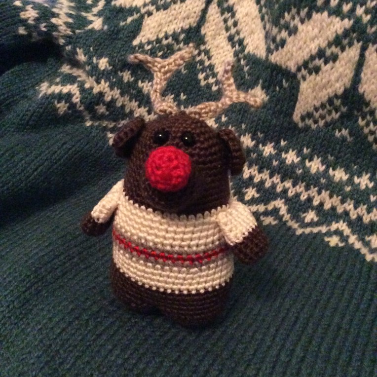 To finish off the set, I turned to the latest issue of Crochet Now magazine and an adorable pattern for Rufus the Reindeer by Tracey Coldwell. This issue comes with a Brian the Bear yarn kit and Rufus is one of the alternative makes for the kit in the magazine. I swapped out the green yarn for his jumper with some spare white and grey yarn from the gnomes.