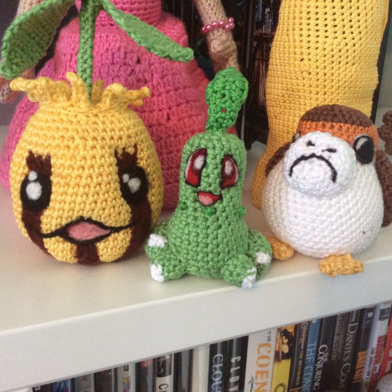 Soon into the pattern it became abundantly clear that this was a very small pattern – tinier than I usually prefer to make for my Pokemon. On the plus side, it meant that Chikorita came into being very quickly, and the bulk was done by the end of the movie.