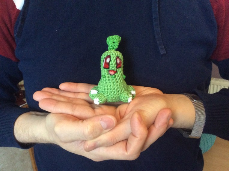 Hey hey all you lazy bones crocheters out there. The reasons why I choose each project to crochet are quite varied but this one was selected out of sheer laziness. We were sitting down at home to watch a film and the urge to crochet came upon me. I looked at the pile of yarn that was still next to me from my last project (Sunkern) and did a quick search through my Ravelry queue to see what I could make with the same colours that meant I didn’t have to get up. Chikorita fit the bill perfectly, so off I went.